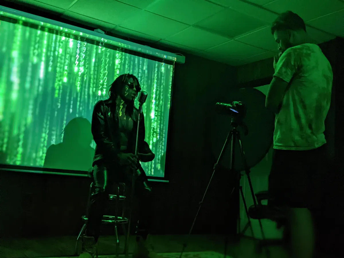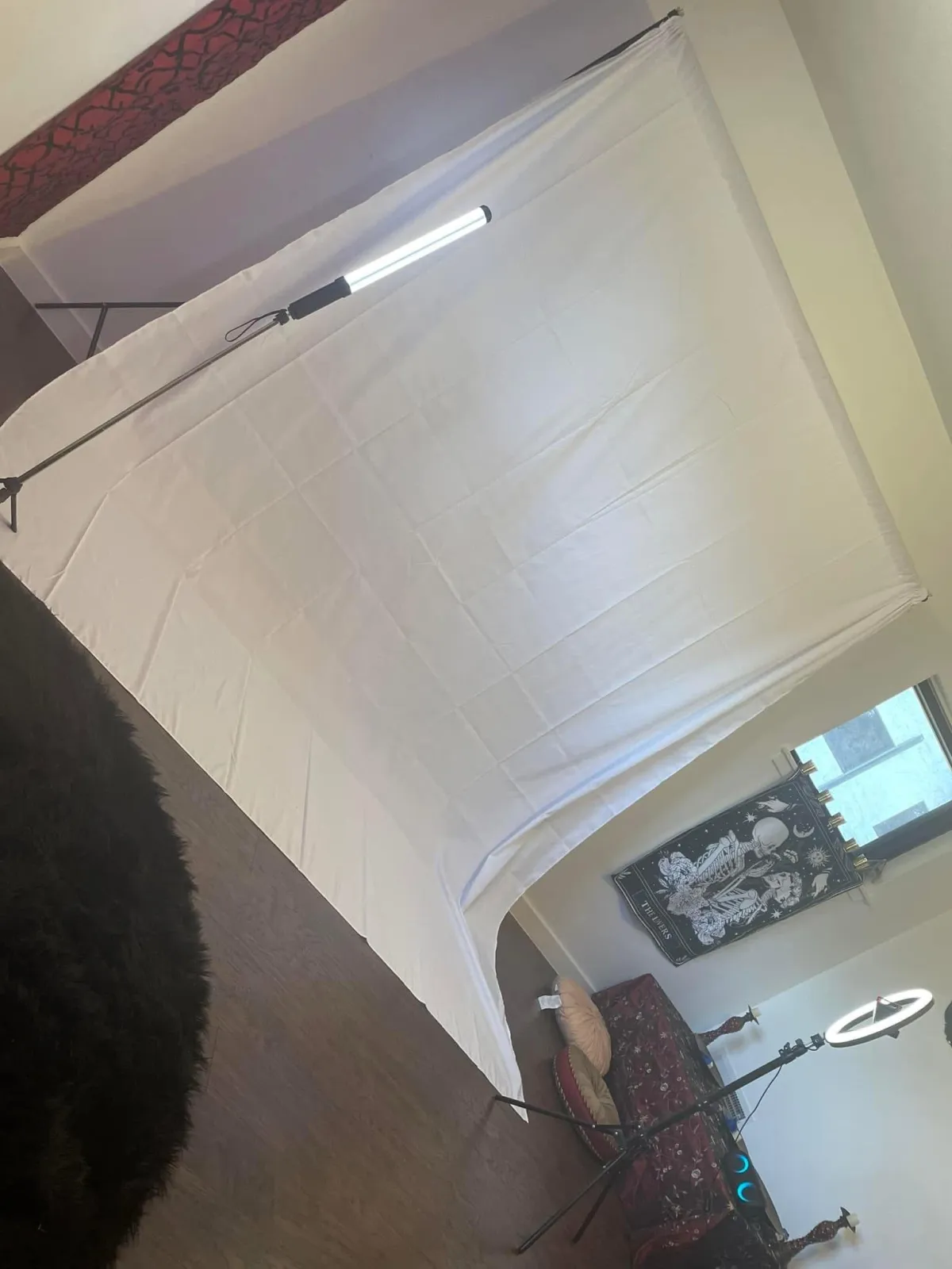 Equipped photo space with lighting, green screen, backdrops, and tools for marketing photos
